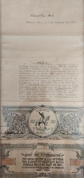 Bono de Cooperación al Ayuntamiento de Puebla para la construcción del Monumento a La Victoria del Ejército Mexicano en la Batalla del 5 de Mayo. 1961.