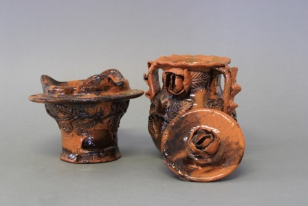 En el conjunto también se observa un pequeño bracero, con una ollita encima; estos eran empleados para sahumar con incienso. Un florero y una figura decorativa de un panzón, similar a los tradicionales de Corpus Christi.