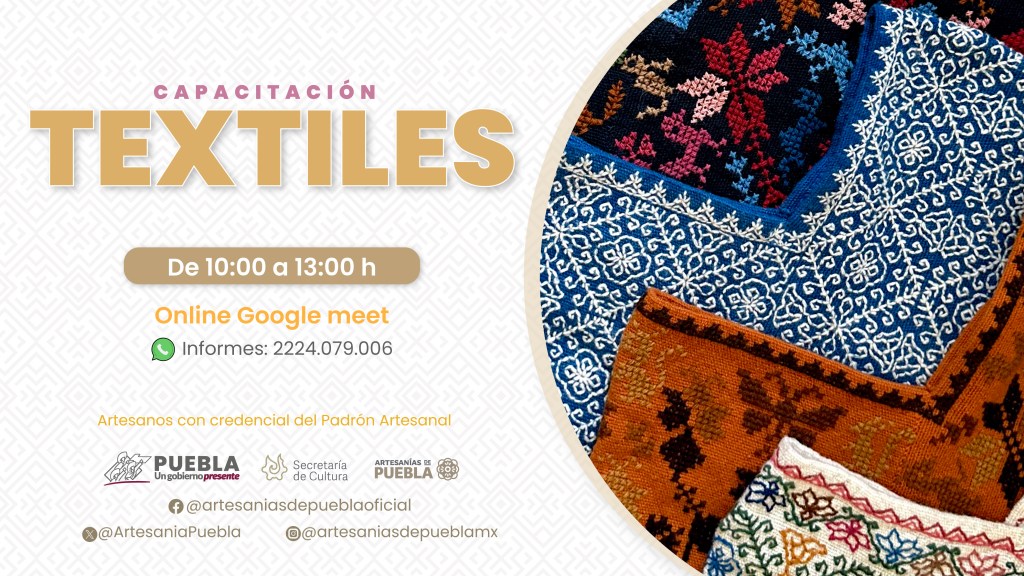 Dichas capacitaciones requieren de registro previo para la inscripción de las y los asistentes. La información detallada de cada una está disponible en las redes sociales Facebook (Artesanías de Puebla) y X (ArtesaniaPuebla), así como en la página web de la dependencia (sc.puebla.gob.mx).