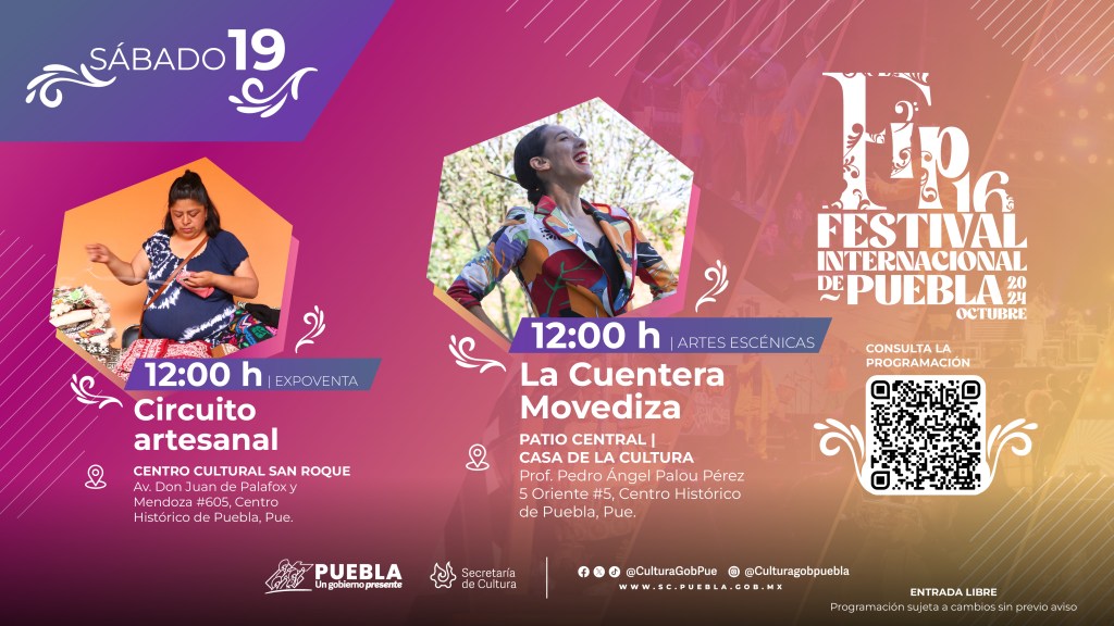 Esta última sede albergará también un espectáculo de cuentacuentos de “La Cuentera Movediza”, a las 12:00 horas, y la obra de teatro “Volver”, de la Compañía “Segundo Piso”, a las 17:00 horas. Todas las actividades del FIP 2024 están disponibles en las redes sociales Facebook: Secretaría de Cultura Puebla, Instagram: @culturagobpuebla y X: @CulturaGobPue.