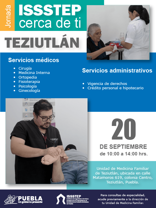CIUDAD DE PUEBLA, Pue.- Como parte de las acciones que desarrolla el gobierno presente de Sergio Salomón para fortalecer el bienestar de la población, el Instituto de Seguridad y Servicios Sociales de los Trabajadores al Servicio de los Poderes del Estado de Puebla invita a la jornada regional “ISSSTEP cerca de ti” en Teziutlán, este viernes 20 de septiembre de 10:00 a 14:00 horas.
