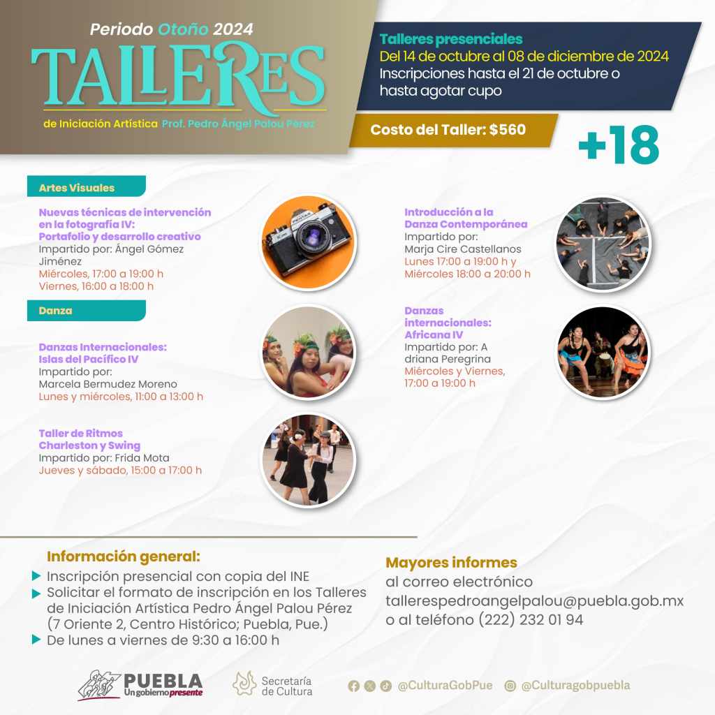 Dichos cursos serán impartidos durante el periodo de otoño, comprendido entre octubre y diciembre del presente año. Los detalles de fechas, horarios, edades, modalidad, costos (en caso de que aplique) y talleristas pueden consultarse en las redes sociales Facebook “Secretaría de Cultura Puebla” y X “@CulturaGobPue”, así como en la página web sc.puebla.gob.mx.