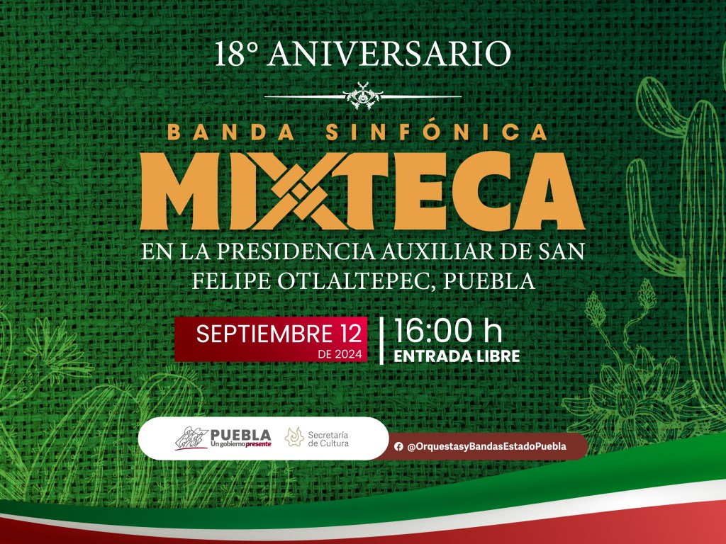 CIUDAD DE PUEBLA, Pue. – La Banda Sinfónica Mixteca, impulsada por el gobierno presente de Sergio Salomón a través de la Secretaría de Cultura, celebrará 18 años de trayectoria con un concierto de aniversario en la localidad de San Felipe Otlaltepec, perteneciente a Tepexi de Rodríguez, municipio sede de dicha agrupación.