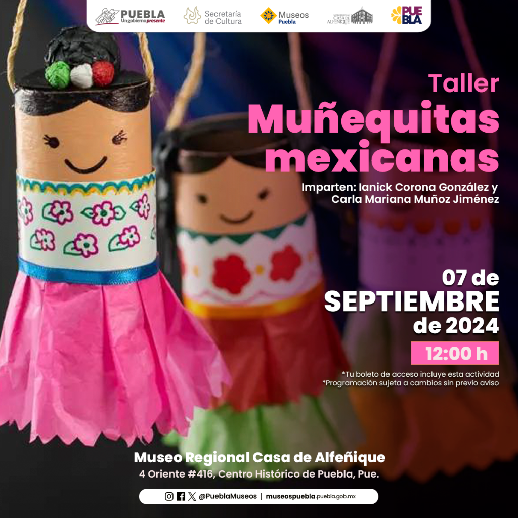La funcionaria destacó que, durante septiembre, también se realizará un concierto “A la luz de las velas”, conferencias y recorridos guiados especiales por el 378 aniversario de la Biblioteca Palafoxiana. Dijo que habrá varias actividades patrias en los museos estatales como en de la Revolución Mexicana “Casa de los Hermanos Serdán”, que van desde ballet folclórico, expo artesanal y un ensamble acústico mexicano. En el recinto regional Casa de Alfeñique se realizará un taller de “Muñequitas mexicanas” el 07 de septiembre a las 12:00 horas.