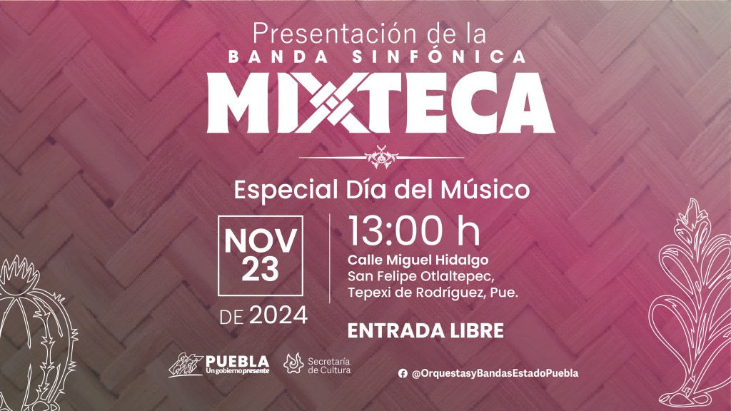 CIUDAD DE PUEBLA, Pue. – Para celebrar el “Día del Músico” (22 de noviembre), el gobierno presente de Sergio Salomón, por medio de la Secretaría de Cultura, llevará a cabo un concierto especial de la Banda Sinfónica Mixteca en la junta auxiliar de San Felipe Otlaltepec, perteneciente al municipio de Tepexi de Rodríguez.