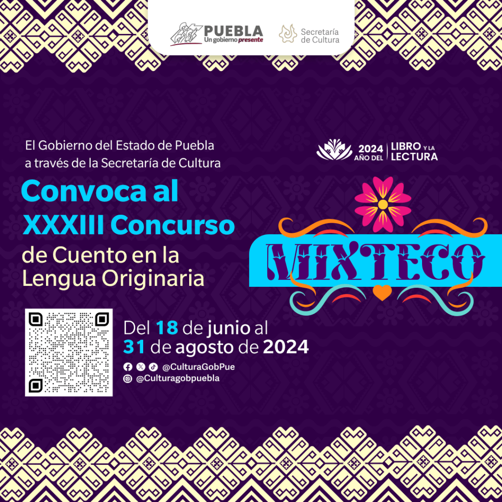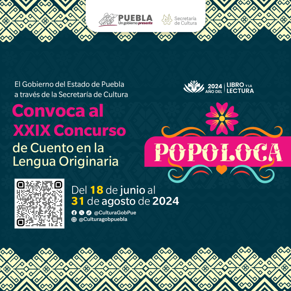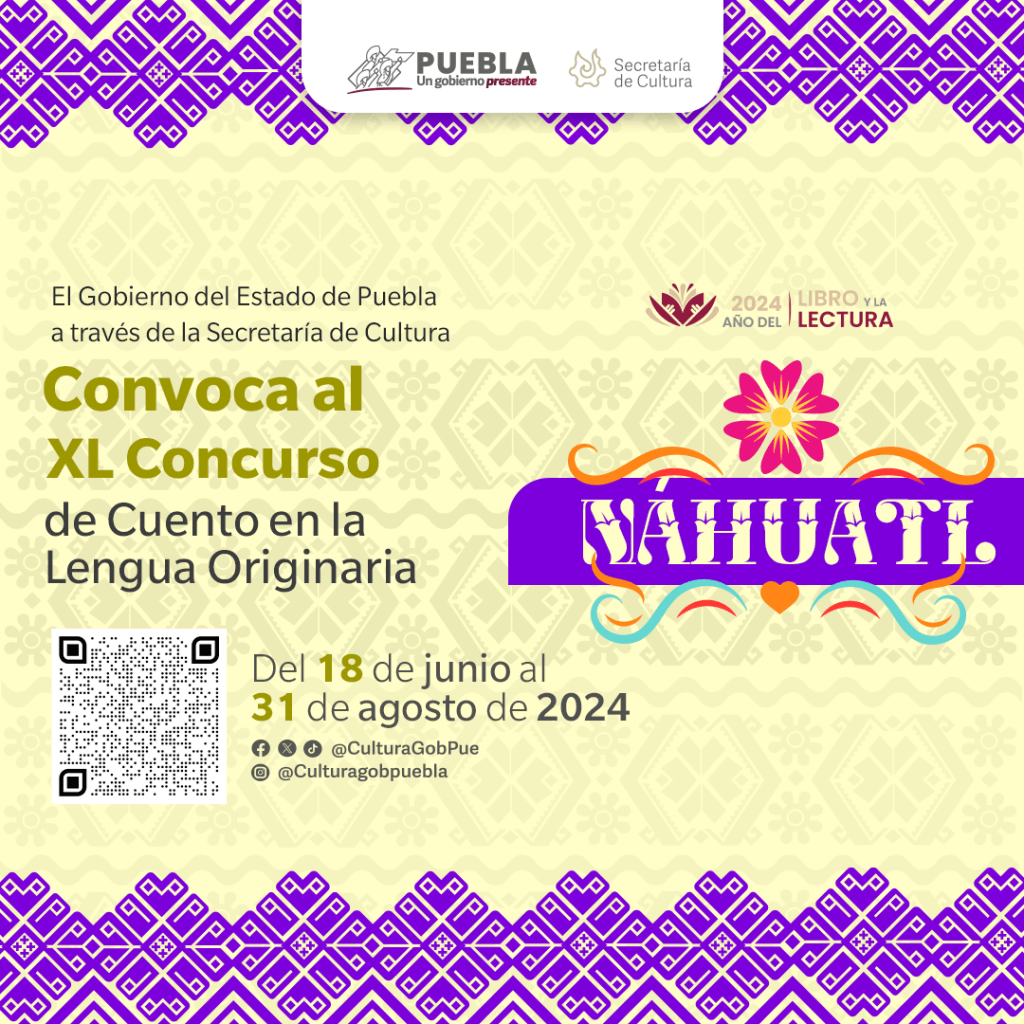 CIUDAD DE PUEBLA, Pue. – El gobierno presente de Sergio Salomón, por medio de la Secretaría de Cultura, extendió del 16 al 31 de agosto el cierre de siete concursos literarios de cuentos escritos en mazateco, mixteco, náhuatl, popoloca, otomí, tepehua y totonaco (lenguas originarias de la entidad), cuyas bases de participación están disponibles en el sitio: sc.puebla.gob.mx.